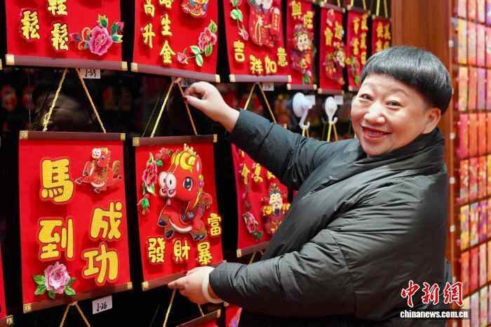 12月6日,商户楼宝娟将马年年画挂在店铺展示区域。中新社记者 董易鑫 摄