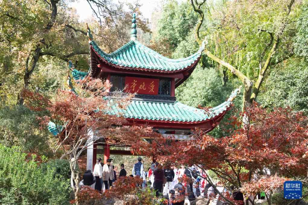 湖南省长沙市岳麓山风景名胜区内的枫叶迎来最佳观赏期,景区内的爱晚亭成为众多游客参观、拍照“打卡点”。据介绍,爱晚亭因唐朝诗人杜牧“停车坐爱枫林晚,霜叶红于二月花”诗句而得名,为全国重点文物保护单位。
