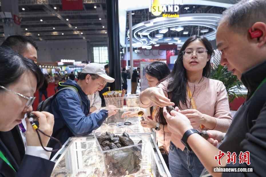 11月9日,第八届中国国际进口博览会继续在上海举行,参观者在越南展台选购沉香把玩件。