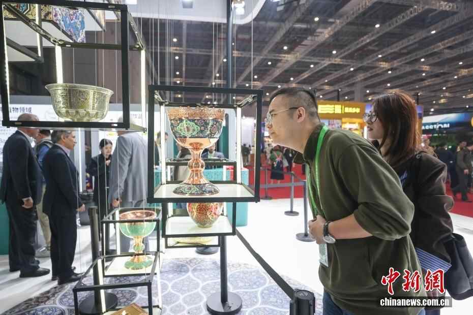 11月9日,第八届中国国际进口博览会继续在上海举行,参观者在伊朗展台欣赏特色器具。