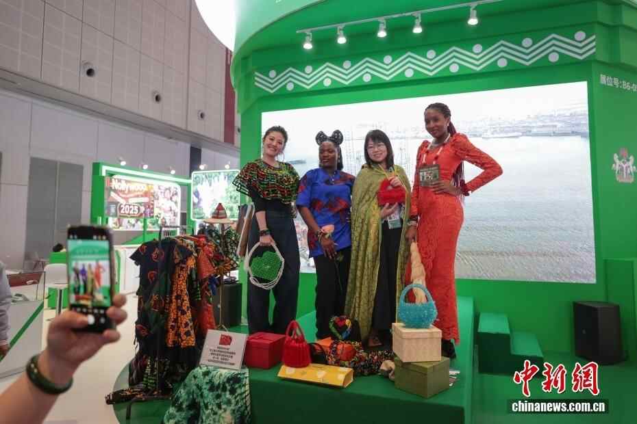 11月9日,第八届中国国际进口博览会继续在上海举行,参观者(右二)在尼日利亚展台身披特色服饰和工作人员合影。