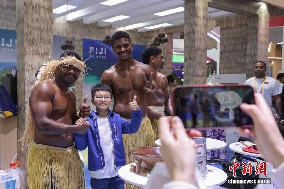 11月9日,第八届中国国际进口博览会继续在上海举行,小朋友在斐济展台和演出的工作人员合影。