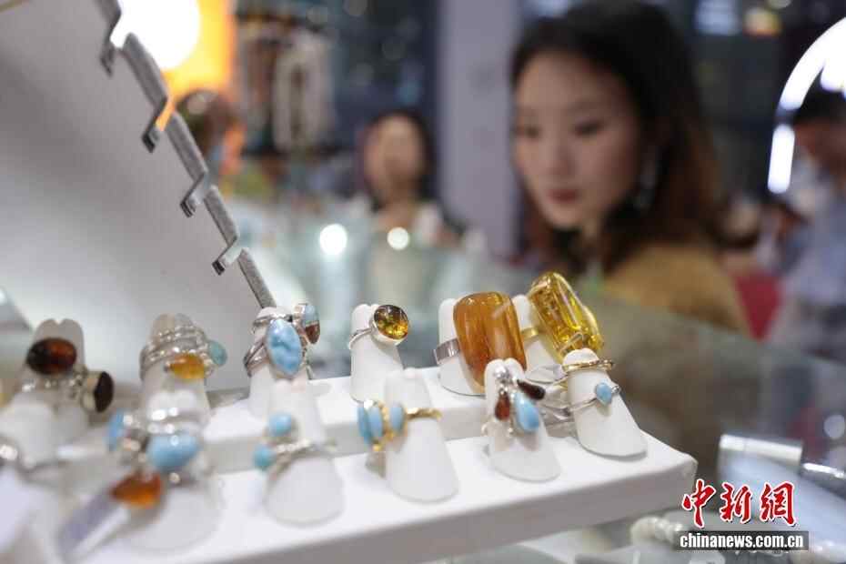 11月9日,第八届中国国际进口博览会继续在上海举行,多米尼加共和国展台的首饰吸引参观者。