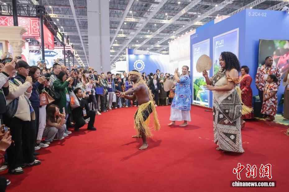 11月9日,第八届中国国际进口博览会继续在上海举行,斐济展台的特色表演吸引众多参观者驻足。