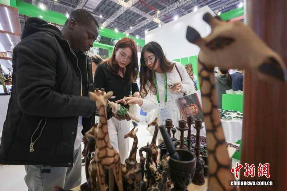 11月9日,第八届中国国际进口博览会继续在上海举行,参观者在赞比亚展台选购饰品。
