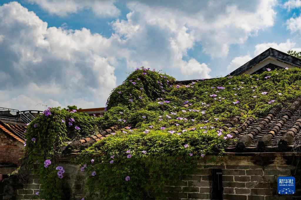 塱头村内一古屋顶上爬满植物(9月13日摄)。