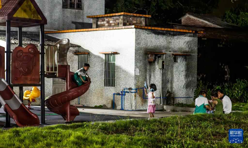 9月12日,孩子们在塱头村新村的公共游乐设施玩耍。