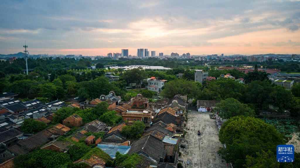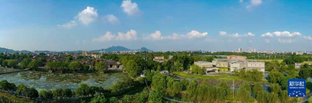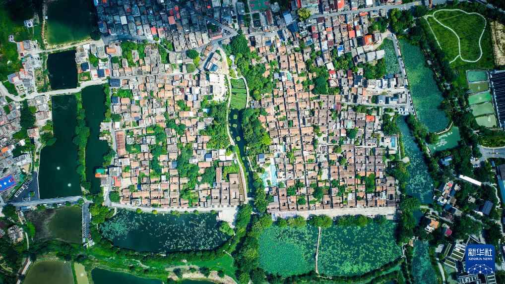 这是9月13日拍摄的塱头村。左侧为古村建筑,右侧为春阳台艺文中心(无人机全景照片)。