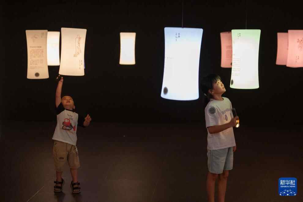 9月13日,游客带孩子在塱头村的春阳台艺文中心体验书法互动装置。