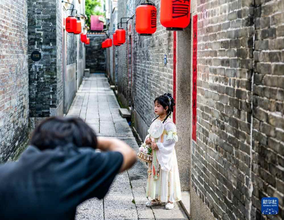 9月13日,摄影师在塱头村积墨楼为孩子拍摄古风写真。