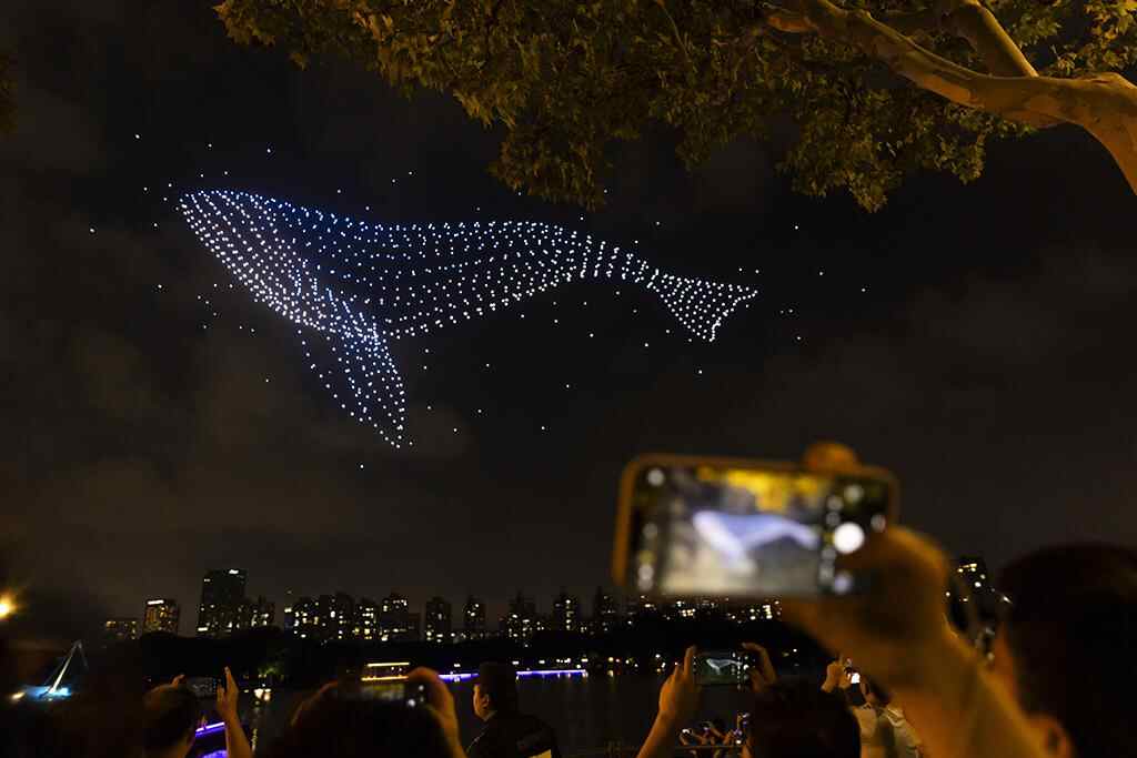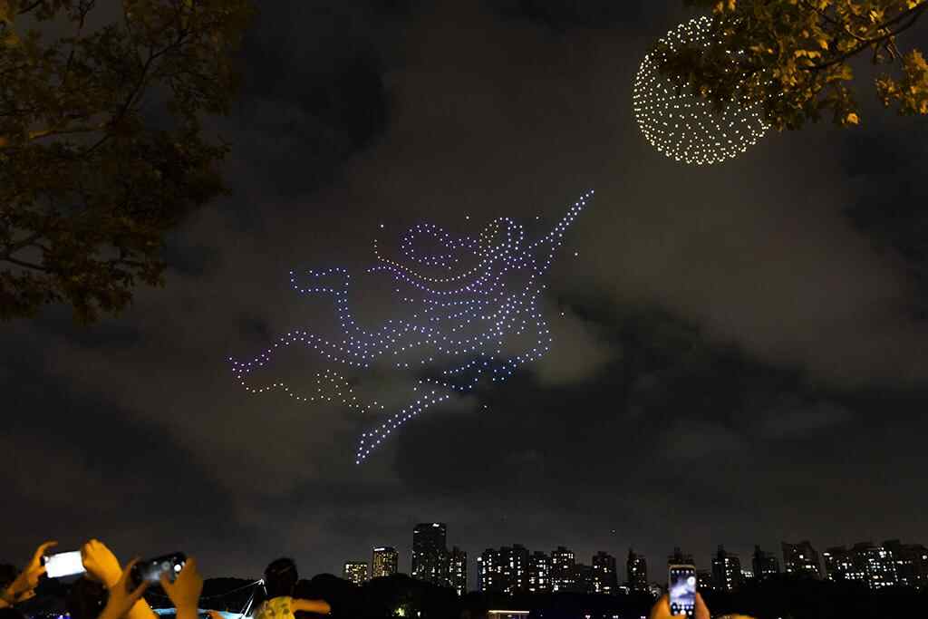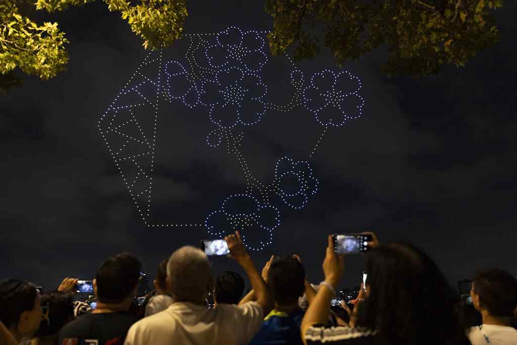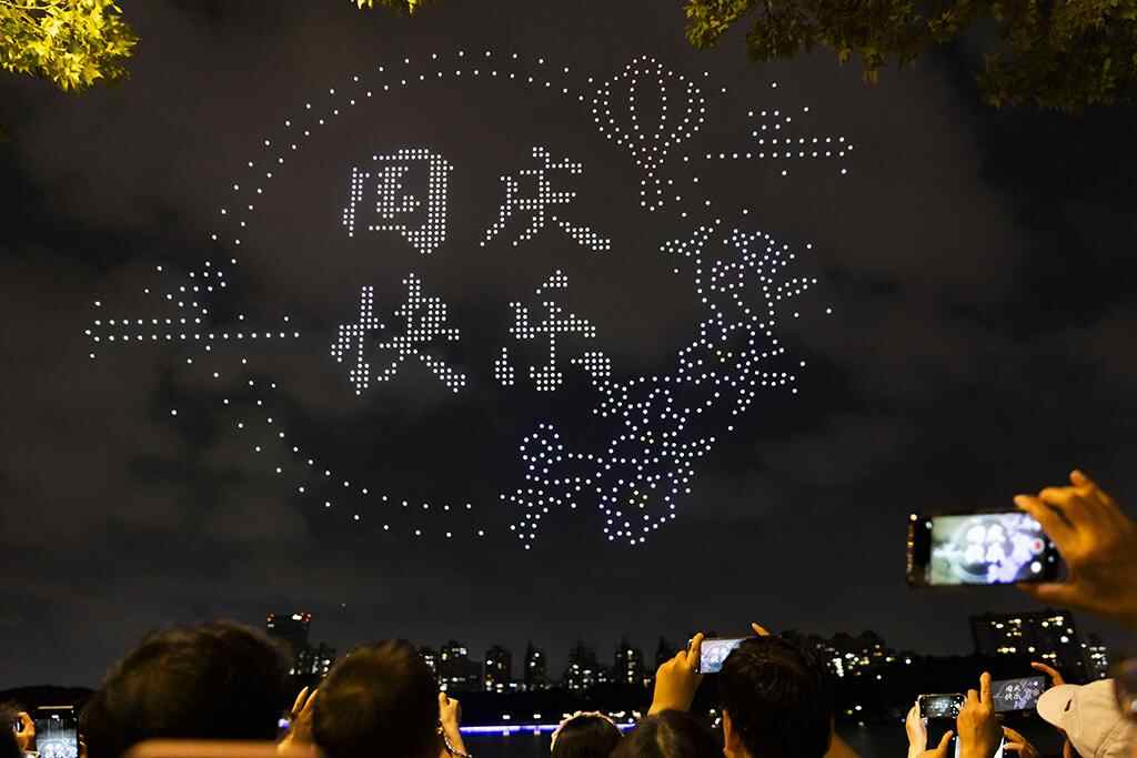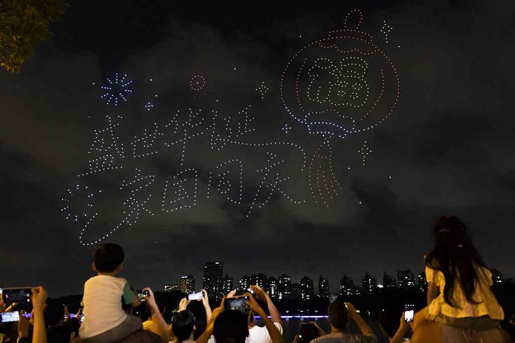9月27日,“世纪璀璨——无人机灯光秀”表演在上海世纪公园举行,1000架无人机在世纪公园镜天湖上空组成“国庆快乐”“盛世华诞 家国同庆”“浦东欢迎您”等字样和玉兰、荷花、梅花等花卉图案,在国庆假期即将到来之际,为市民游客献上一场视觉盛宴。新华社记者 王翔 摄