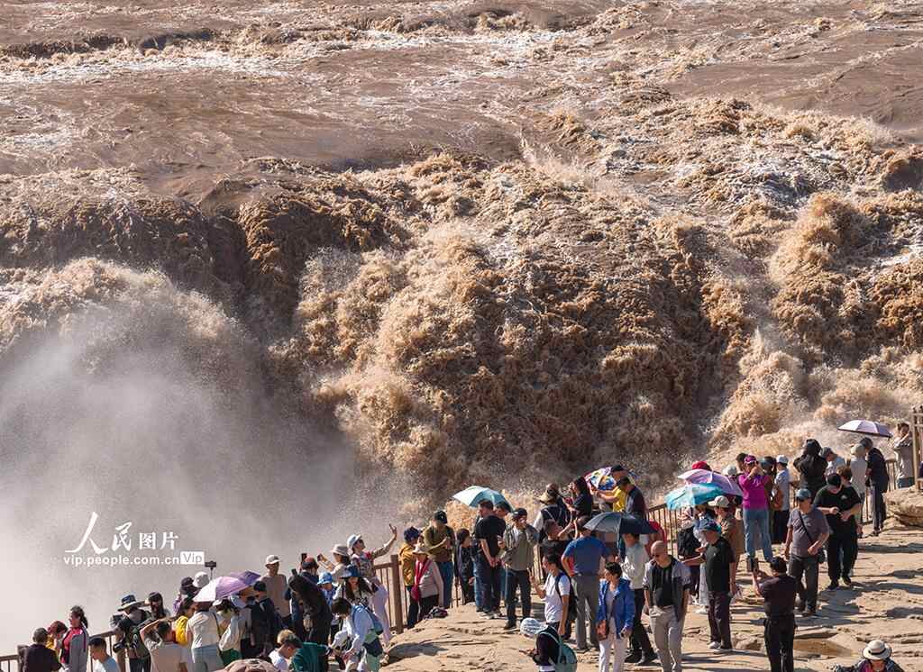 2025年9月25日,位于山西省吉县和陕西省宜川县交界处的黄河壶口瀑布景区,瀑布气势磅礴,吸引各地游客前来观赏瀑布美景。闫锐鹏摄(人民图片网)