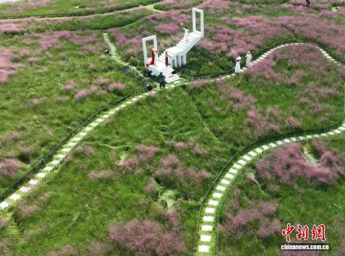 近日,广西南宁园博园里3万平方米的粉黛花迎来绚烂绽放,吸引众多民众前来打卡拍照,乐享初秋时光。图为民众在粉黛花旁打卡拍照。滕忠 摄