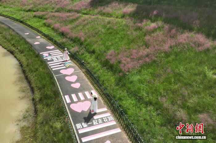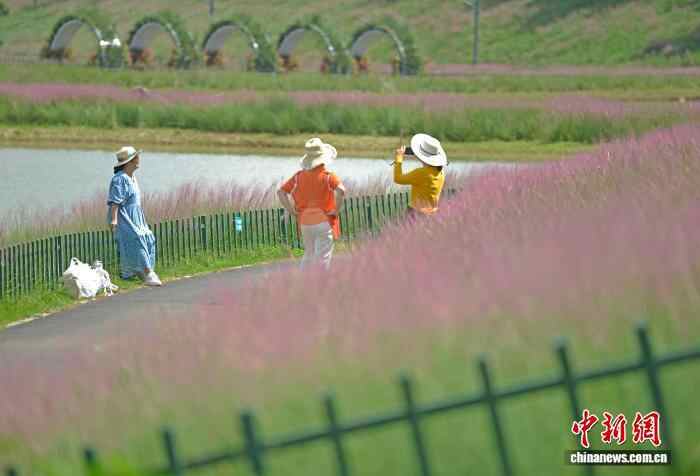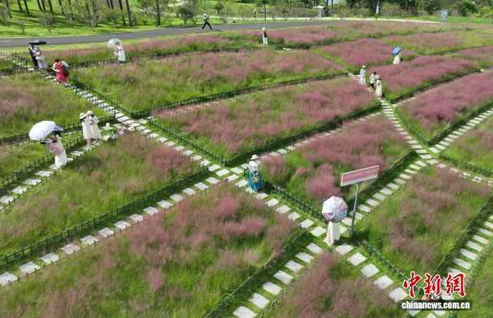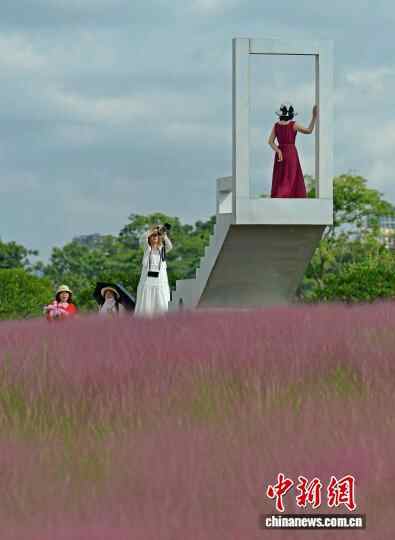 近日,广西南宁园博园里3万平方米的粉黛花迎来绚烂绽放,吸引众多民众前来打卡拍照,乐享初秋时光。图为民众在粉黛花旁打卡拍照。滕忠 摄