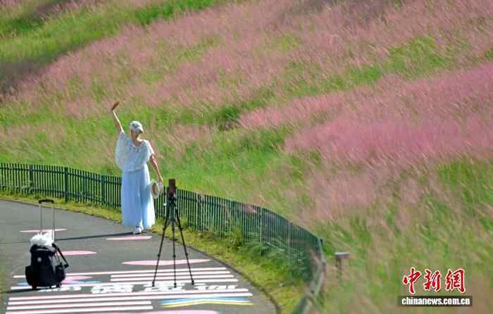 图为民众在粉黛花旁打卡拍照。滕忠 摄