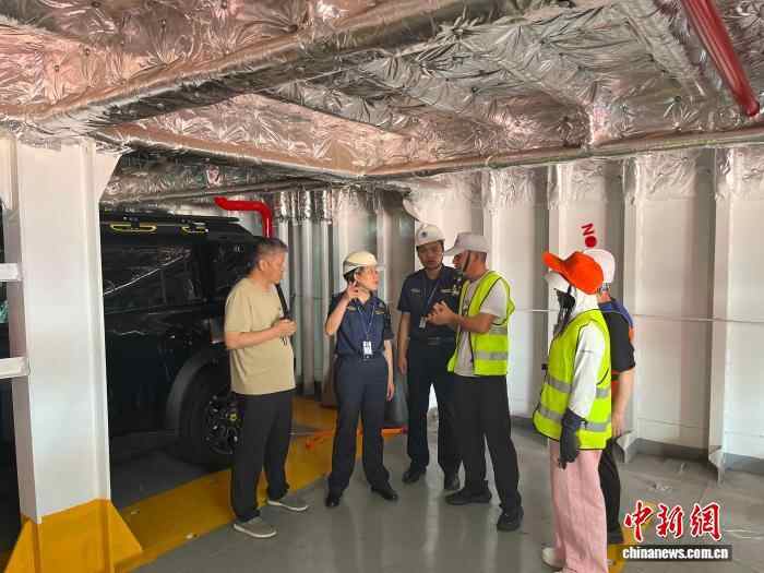 图为海事部门工作人员在现场进行保障工作。为保障航线顺利开通和滚装船首航成功,温州海事部门联合多家单位,制定“一船一策”保障方案,开辟24小时“优先查验”绿色通道,实施“远程预检+登轮检查”等,全方位保障船舶运输安全。浙江海事局供图