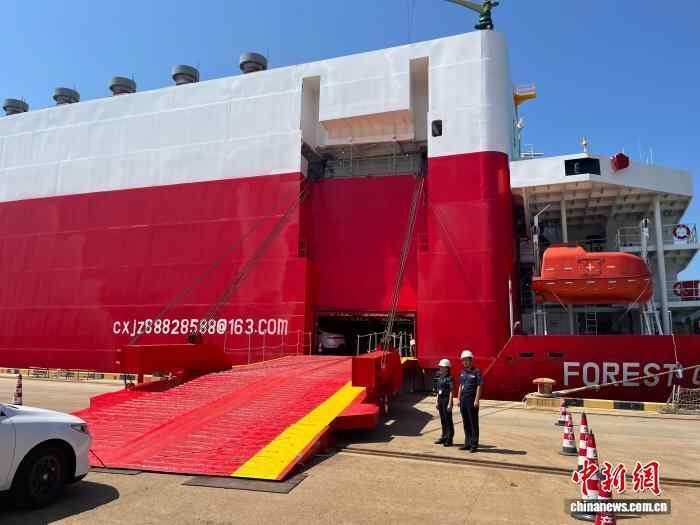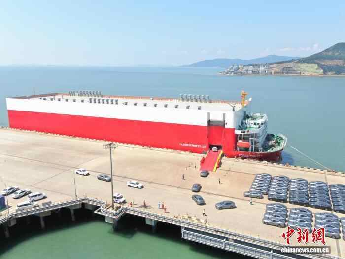 9月15日,巴拿马籍滚装船“森林荣耀”搭载400辆中国新能源汽车,在海事巡逻艇的护航下,从温州港状元岙港区出发前往迪拜。这标志着温州至中东海上新航线正式开通,也是温州港建港以来首次开通用于新能源汽车整车滚装出运的航线,为中国新能源汽车走向国际增添了一条物流通道。图为“森林荣耀”与停在港口的新能源汽车。(无人机照片)浙江海事局供图