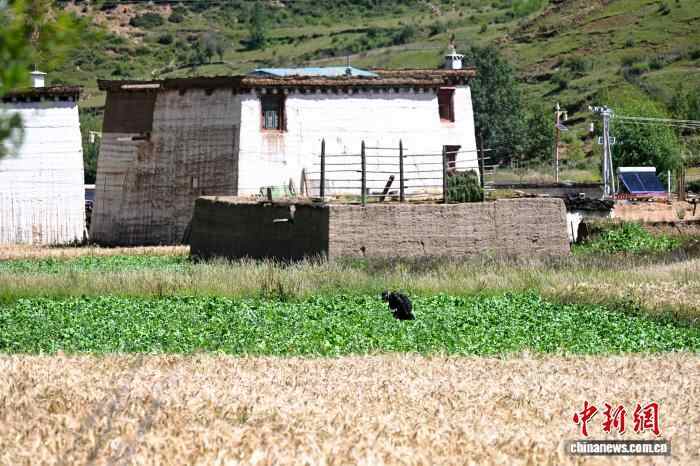 9月14日,初秋时节,四川省甘孜州乡城县正斗村千亩青稞成熟,即将迎来收割。村内一栋栋白藏房与成片青稞相映生辉,构成一幅川西田园画卷。图为村民在田间劳作。中新社记者 张浪 摄