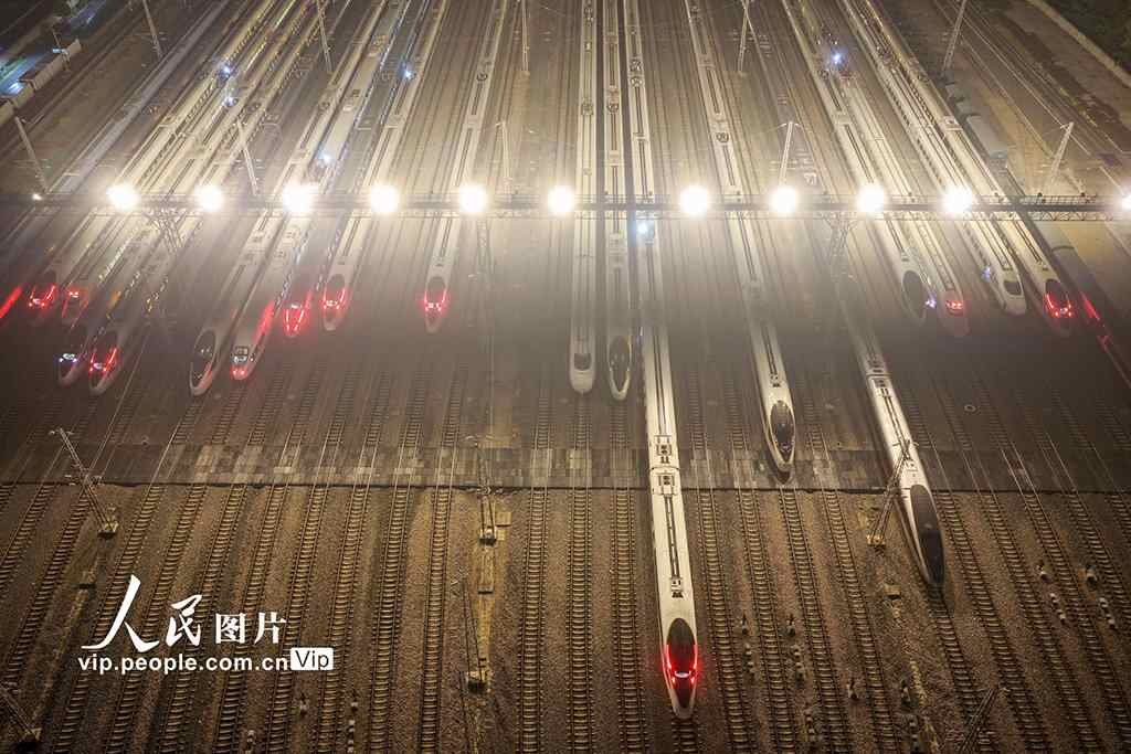 2025年9月7日凌晨,一列列检修完毕的动车组停靠在南京动车段南京南动车运用所存车线上。